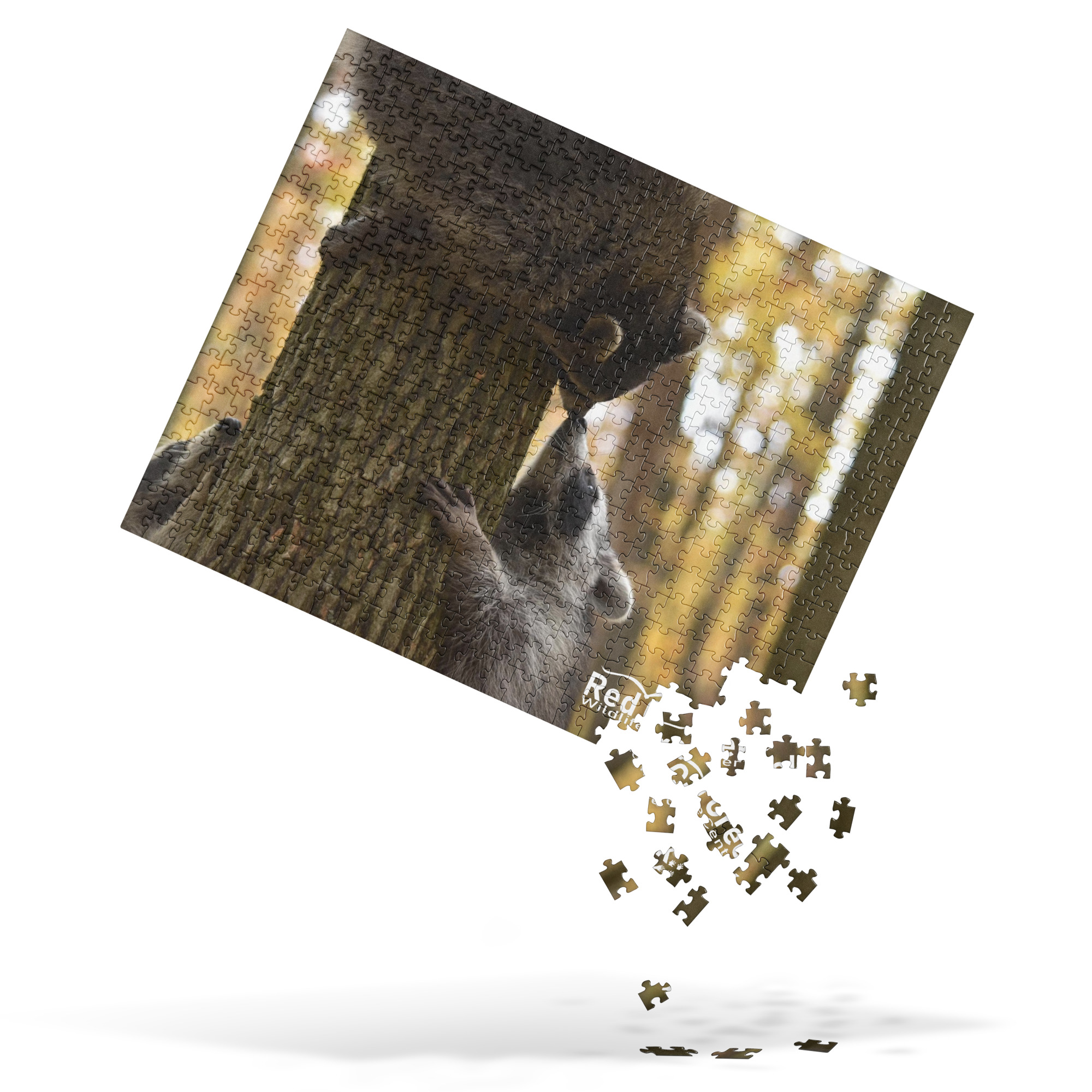 This photographic jigsaw puzzle features two raccoons perched in a tree after their successful release back into the wild—a quiet, powerful moment that represents everything wildlife rehabilitation is about.