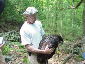 “So, I just looked up Y 94. She came from a nest we call New York 20, one of our early and very productive nests along the Delaware River in…a place called Tusten. She was the only chick we banded, meaning there was only one in the nest in 2004. The interesting thing is that I put a solar powered radio transmitter on her back at the time. She was a large nestling, approximately 9 weeks old, so could easily handle the backpack transmitter. These transmitters are designed to drop off eventually…”