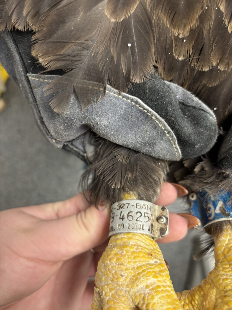 Previous Image Next Image Web_These identification bands on her ankles allowed us to learn more about this eagle’s history. These identification bands on her ankles allowed us to learn more about this eagle’s history.